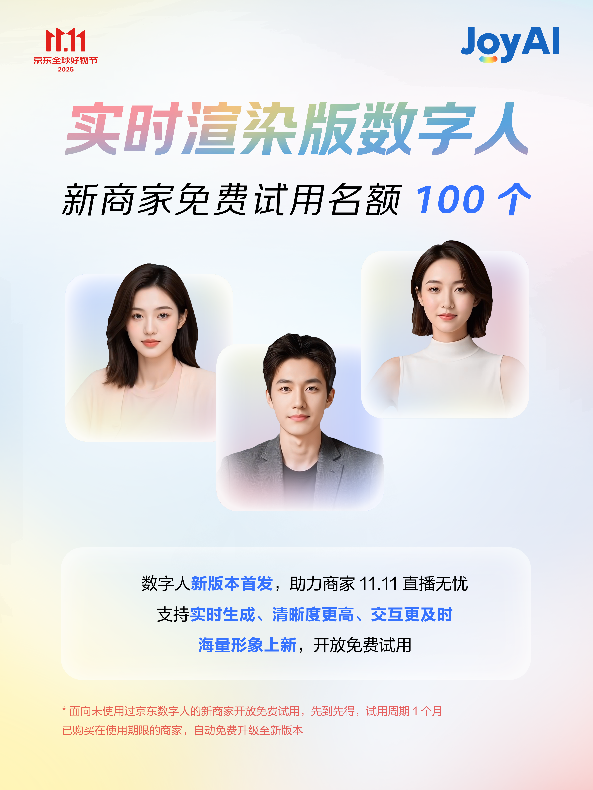京东将11.11取大模子、数字人、智能体等深度融合,实现从“被动应对”到“自动办事”的改变。可以或许无效降低曲播成本,加快增加。大促场景也为AI东西供给了最佳落地。京东免费AI东西包促商家增加>及时衬着版数字人是本次AI增加东西包的焦点亮点。输入商品链接。